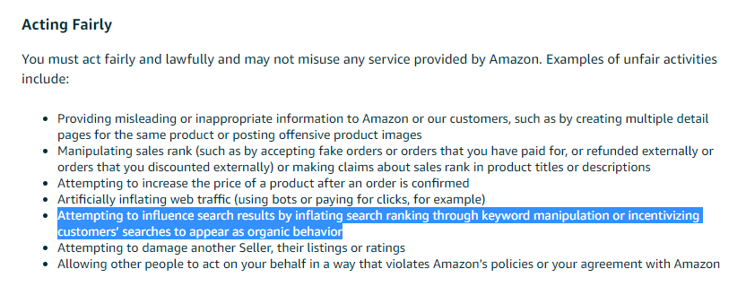 Another type of URL you can use are Super URLs which help products rank higher for valuable keywords. Super URLs work by making the ranking algorithm categorize each click as coming from an organic search. The use of Super URLs is in a gray area. Amazon hasn't directly mentioned Super URLs in their Terms of Service, however, they did explicitly mention that manual manipulation of their search engine is considered a breach of the Terms of Service as seen below: