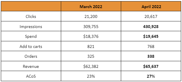 Below are some performance results that we were able to generate for one of our G4A clients during the months of March 2022 and April 2022. We can’t disclose the brand but they are in the competitive wellness and fitness product category: