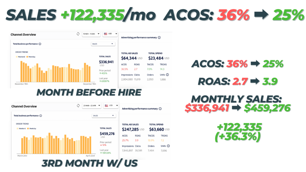 After just three months, we were able to boost sales by offering $100,000 a month while improving ACOS from 36% to 25%. This fantastic turnout was due to improving Sponsored Products & Sponsored Brands campaigns. And more notably, because we expanded their reach OFF-Amazon with Amazon DSP ads.