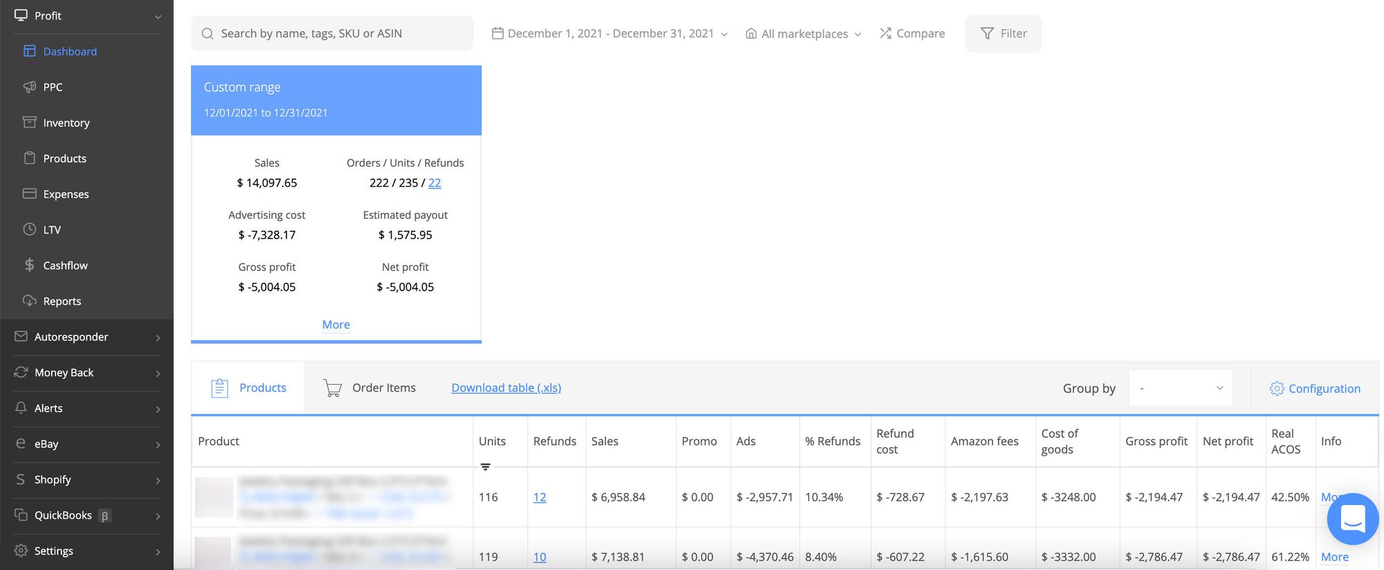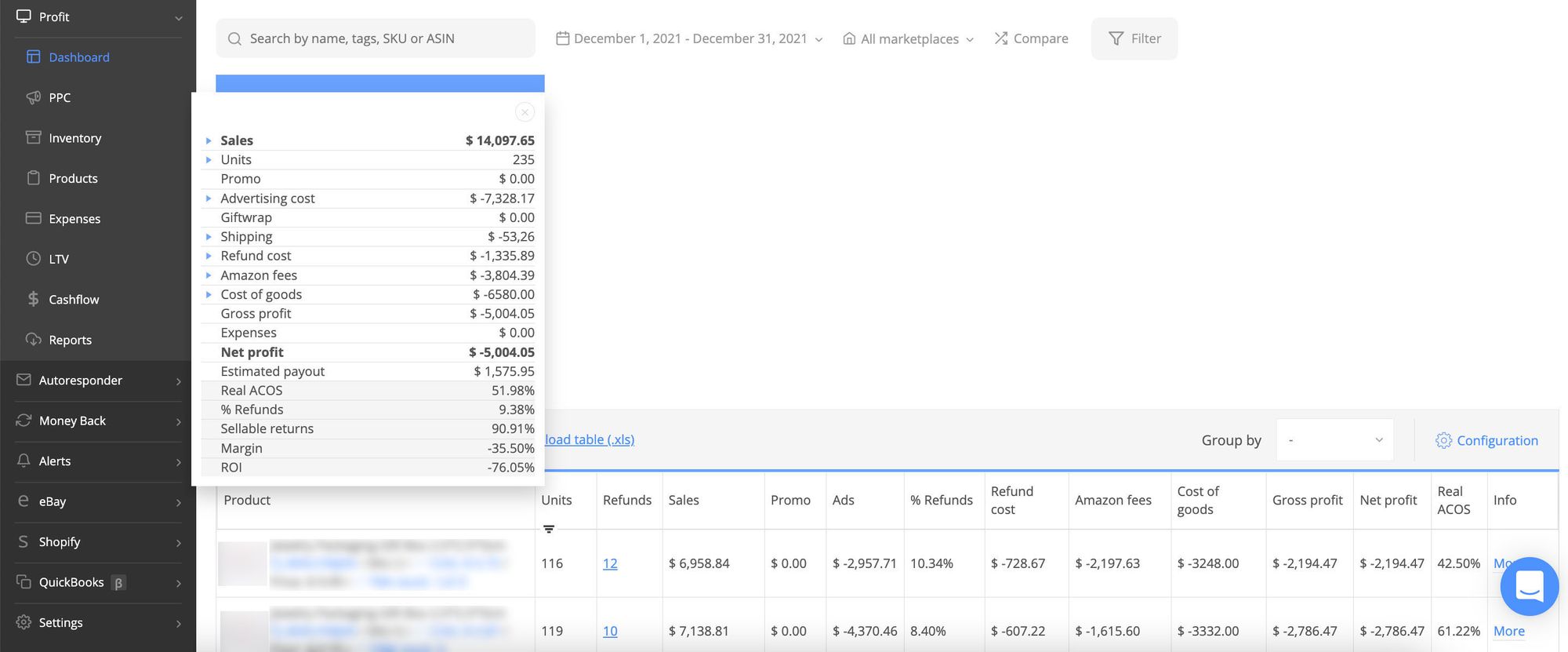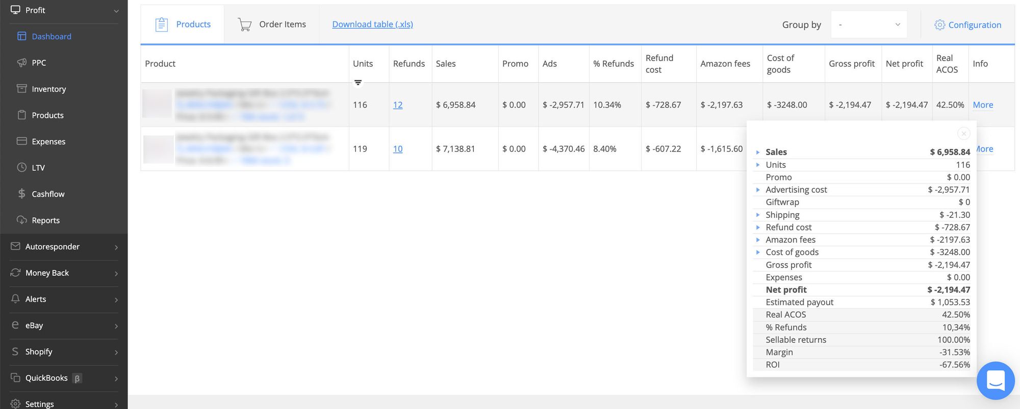So, if we look at SKUs details, we'll find that the first SKU has generated 2 786.47 net loss. Its margin is -41.22%, and ROI -84.26%. The critical role here played the investments in marketing and high ACOS.